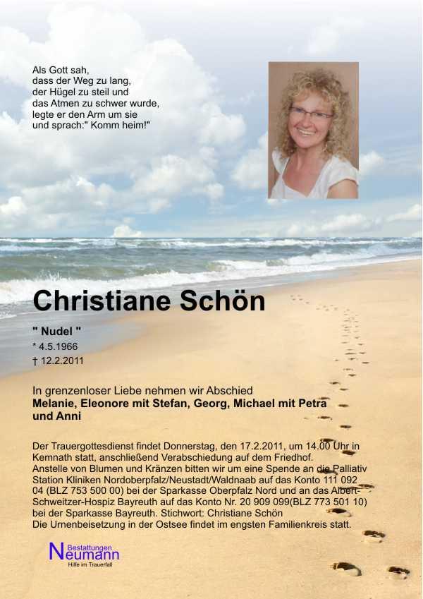 Konto 111 092 04 (BLZ 753 500 00) bei der Spark. Oberpfalz Nord und an das Albert-Schweitzer-Hospiz Bayreuth Konto 20 909 099 (BLZ 773 501 10) bei der Spark. Bayreuth. Stichwort: Christiane Schön.