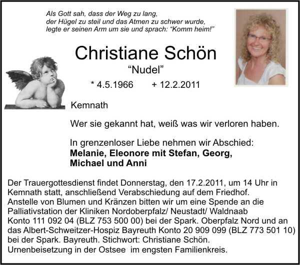 Der Trauergottesdienst findet Donnerstag, den 17.2.2011, um 14 Uhr in Kemnath statt, anschließend Verabschiedung auf dem Friedhof.