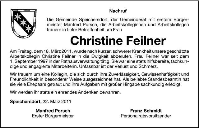 Die Gemeinde Speichersdorf, der Gemeinderat mit erstem Bürgermeister Manfred Porsch, die Arbeitskolleginnen und Arbeitskollegen trauern in tiefer Betroffenheit um Frau Christine Feilner.