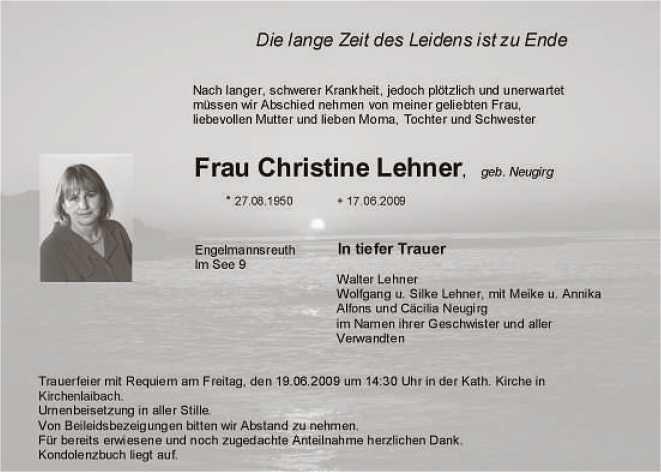 Trauerfeier mit Requiem am Freitag, 19.6.2009 um 14.30 Uhr in der kath. Kirche Kirchenlaibach. Urnenbeisetzung in aller Stille.