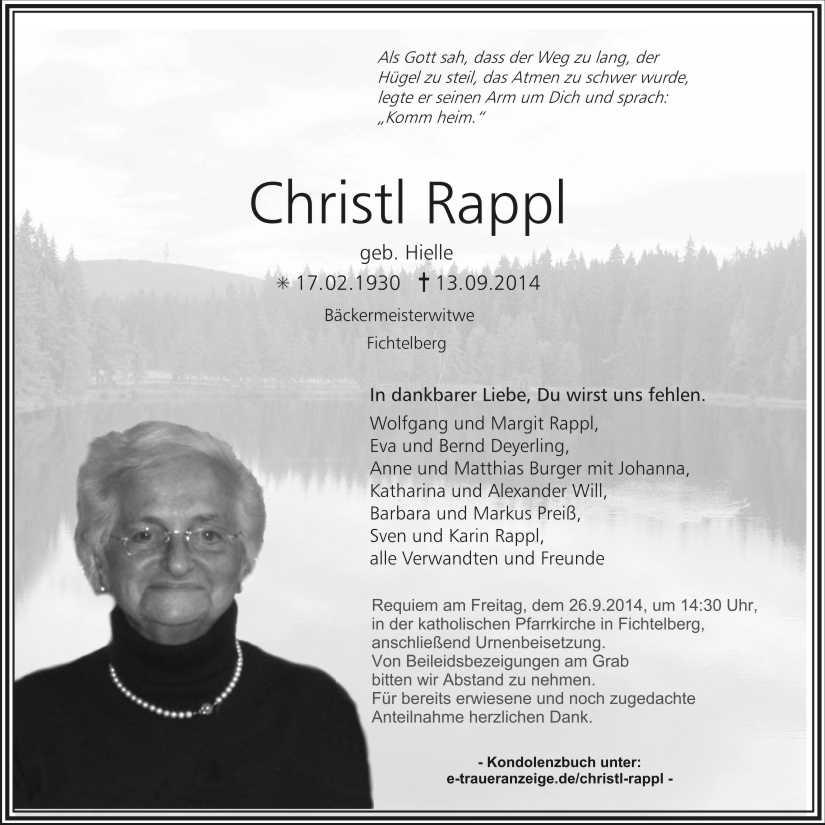 Requiem am Freitag, dem 26.9.2014, um 14.30 Uhr, in der katholischen Pfarrkirche in Fichtelberg, anschließend Urnenbeisetzung. Von Beileidsbezeigungen am Grab bitten wir Abstand zu nehmen. Für bereits erwiesene und noch zugedachte Anteilnahme herzlichen Dank.