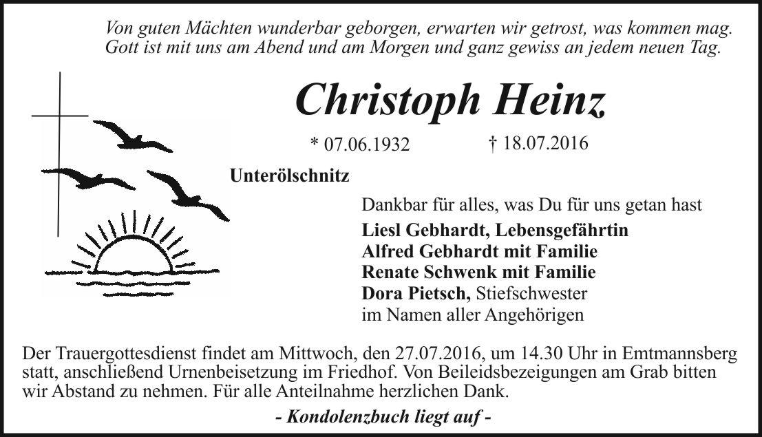 Der Trauergottesdienst findet am Mittwoch, den 27.07.2016, um 14.30 Uhr in Emtmannsberg statt, anschließend Urnenbeisetzung im Friedhof. Für alle Anteilnahme herzlichen Dank. - Kondolenzbuch liegt auf -