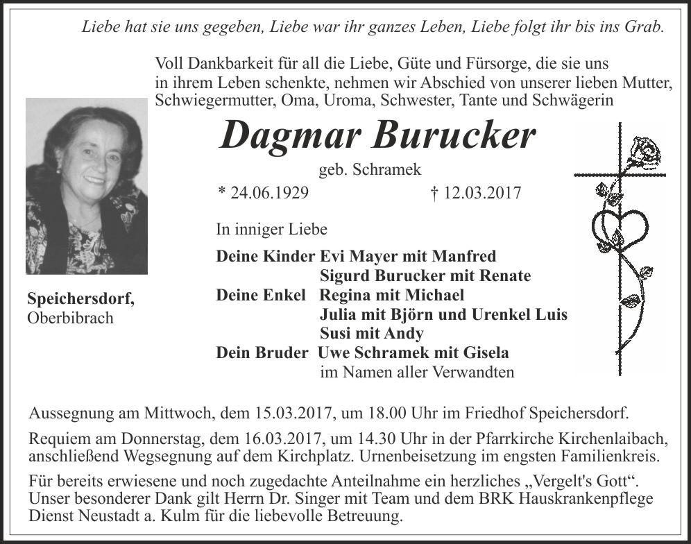 Aussegnung am M ittwoch, den 15.03.2017, um 18.00 Uhr im Friedhof Speichersdorf.