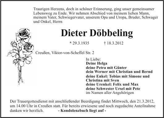 Der Trauergottesdienst mit anschließender Beerdigung findet Mittwoch, den 21.3.2012, um 14.00 Uhr in Creußen statt. Für bereits erwiesene und noch zugedachte Anteilnahme danken wir herzlich. - Kondolenzbuch liegt auf -