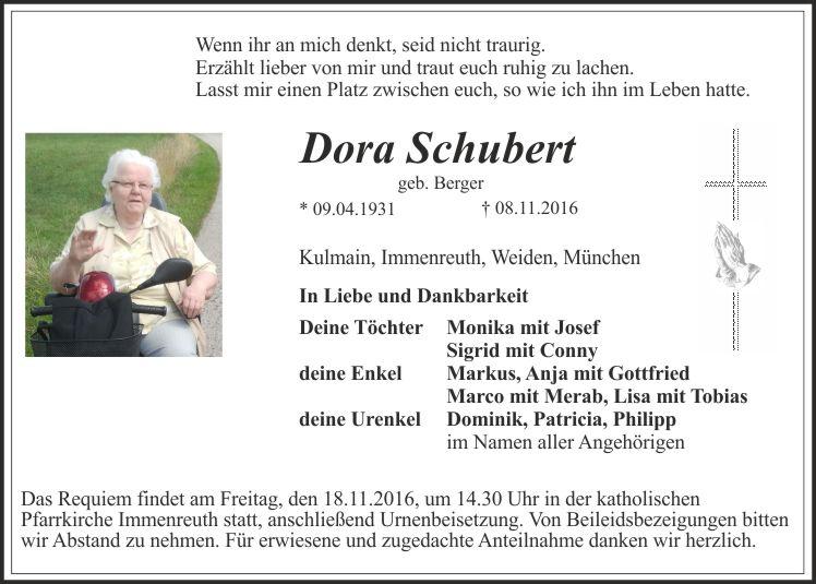 Das Requiem findet am Freitag, den 18.11.2016, um 14.30 Uhr in der katholischen Pfarrkirche Immenreuth statt, anschließend Urnenbeisetzung. Von Beileidsbezeigungen bitten wir Abstand zu nehmen. Für erwiesene und zugedachte Anteilnahme danken wir herzlich.