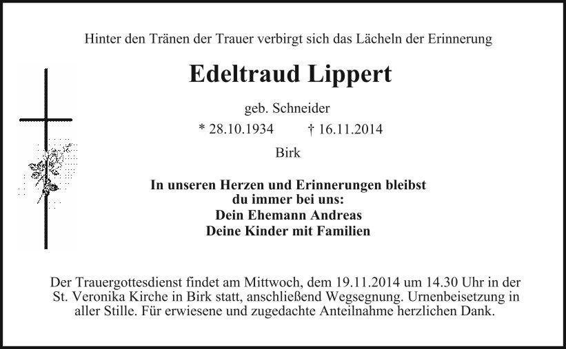 Der Trauergottesdienst, mit anschließender Wegsegnung findet am Mittwoch, dem 19.11.2014 um 14:30 Uhr in der St. Veronika Kirche in Birk statt.