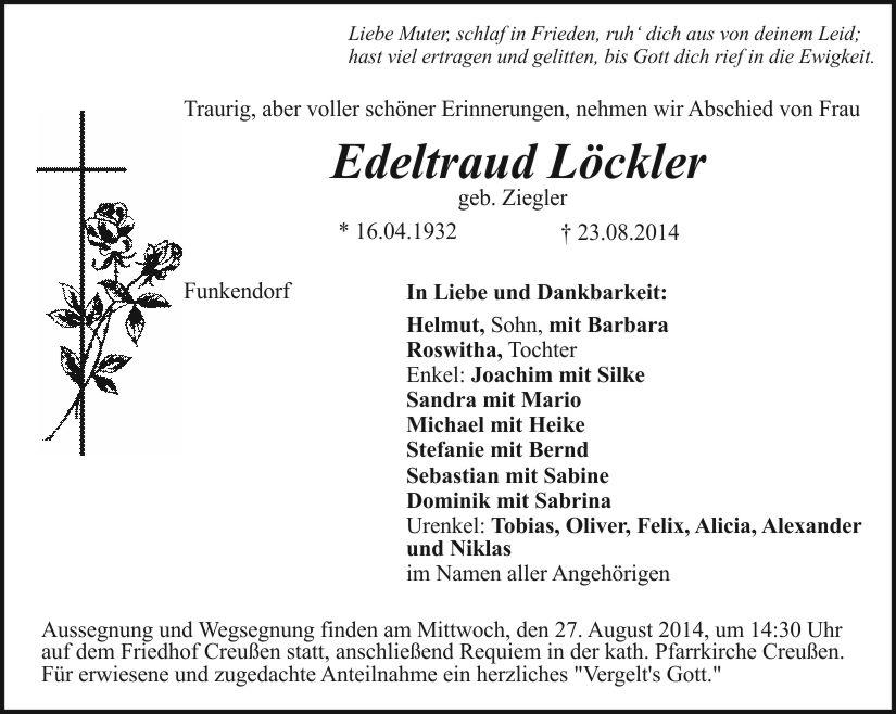 Aussegnung und Wegsegnung finden am Mittwoch, den 27. August 2014, um 14:30 Uhr auf dem Friedhof Creußen statt, anschließend Requiem in der kath. Pfarrkirche Creußen. Für erwiesene und zugedachte Anteilnahme ein herzliches "Vergelt's Gott."