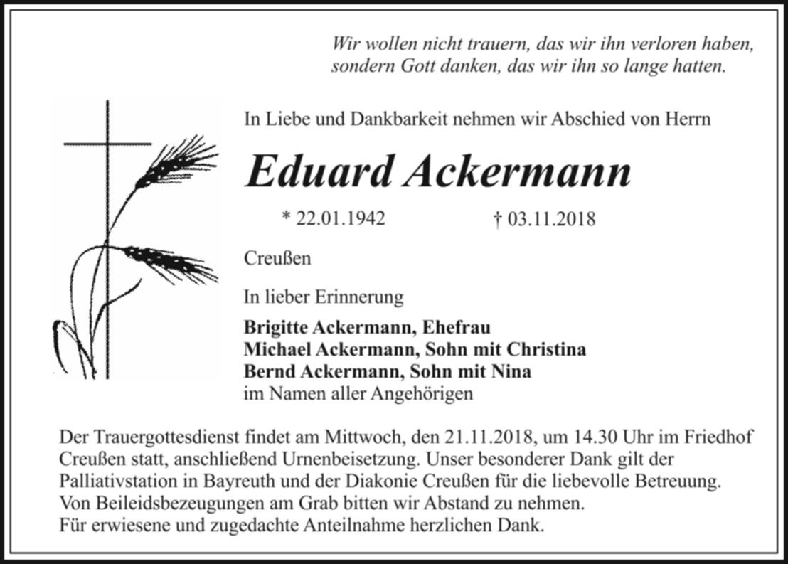 Der Trauergottesdienst findet am Mittwoch, den 21.11.2018, um 14.30 Uhr im Friedhof Creußen statt, anschließend Urnenbeisetzung. Unser besonderer Dank gilt der Palliativstation in Bayreuth und der Diakonie Creußen für die liebevolle Betreuung.