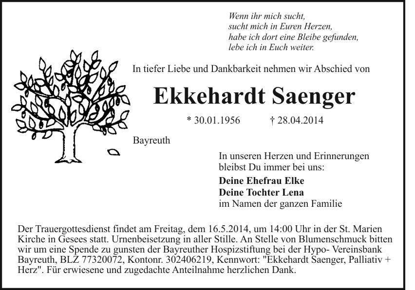 Der Trauergottesdienst findet am Freitag, dem 16.5.2014, um 14:00 Uhr in der St. Marien Kirche in Gesees statt. Urnenbeisetzung in aller Stille. An Stelle von Blumenschmuck bitten wir um eine Spende zu gunsten der Bayreuther Hospizstiftung bei der Hypo- Vereinsbank Bayreuth, BLZ 77320072, Kontonr. 302406219, Kennwort: "Ekkehardt Saenger, Palliativ + Herz". Für erwiesene und zugedachte Anteilnahme herzlichen Dank.