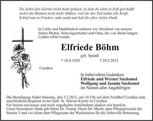 Die Beerdigung findet Samstag, den 3.3.2012, um 10 Uhr auf dem Friedhof Creußen statt, anschließend Requiem in der kath. St. Marien Kirche in Creußen.