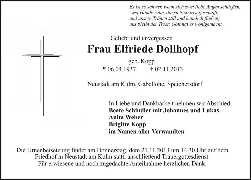 Die Urnenbeisetzung findet am Donnerstag, dem 21.11.2013 um 14.30 Uhr auf dem Friedhof in Neustadt am Kulm statt, anschließend Trauergottesdienst.