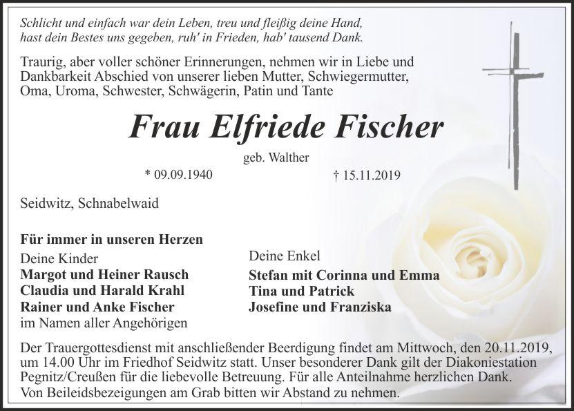 Der Trauergottesdienst mit anschließender Beerdigung findet am Mittwoch, den 20.11.2019, um 14.00 Uhr im Friedhof Seidwitz statt. Unser besonderer Dank gilt der Diakoniestation Pegnitz/Creußen für die liebevolle Betreuung. Für alle Anteilnahme herzlichen Dank.