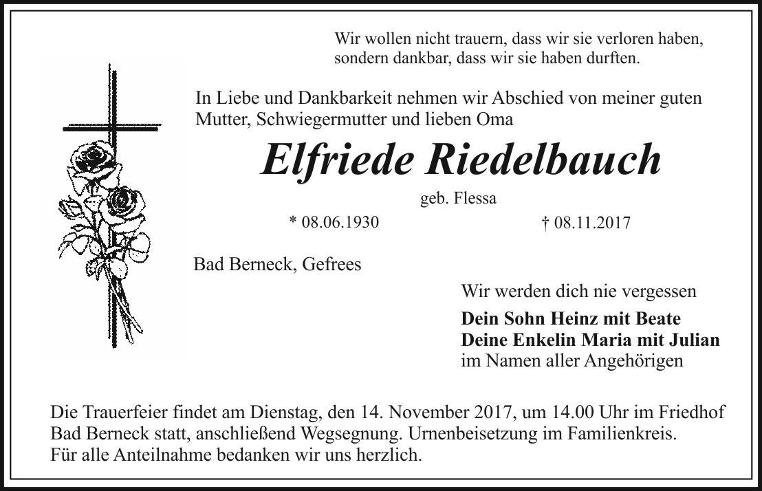 Die Trauerfeier findet am Dienstag, den 14. November 2017, um 14.00 Uhr im Friedhof Bad Berneck statt, anschließend Wegsegnung. Urnenbeisetzung im Familienkreis.