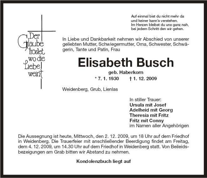 Die Beisetzung findet am Freitag, 04.12.2009 um 14:30 Uhr auf dem Friedhof in Weidenberg statt.