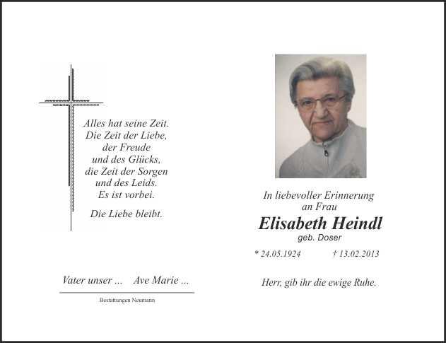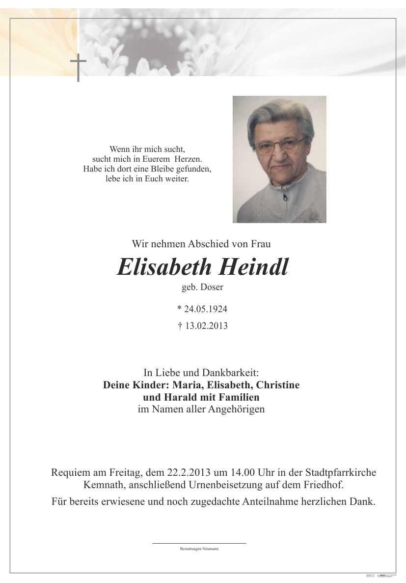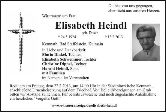 Requiem am Freitag, dem 22.2.2013, um 14.00 Uhr in der Stadtpfarrkirche Kemnath, anschließend Urnenbeisetzung auf dem Friedhof. Von Beileidsbezeigungen am Grab bitten wir Abstand zu nehmen. Für bereits erwiesene und noch zugedachte Anteilnahme ein herzliches "Vergelt's Gott!"www.e-traueranzeige.de/elisabeth-heindl
