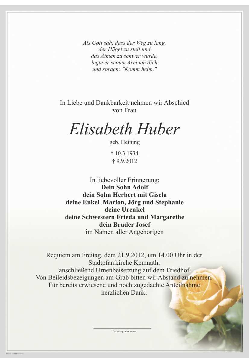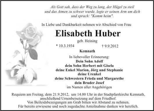 Requiem am Freitag, dem 21.9.2012, um 14.00 Uhr in der Stadtpfarrkirche Kemnath, anschließend Urnenbeisetzung auf dem Friedhof.