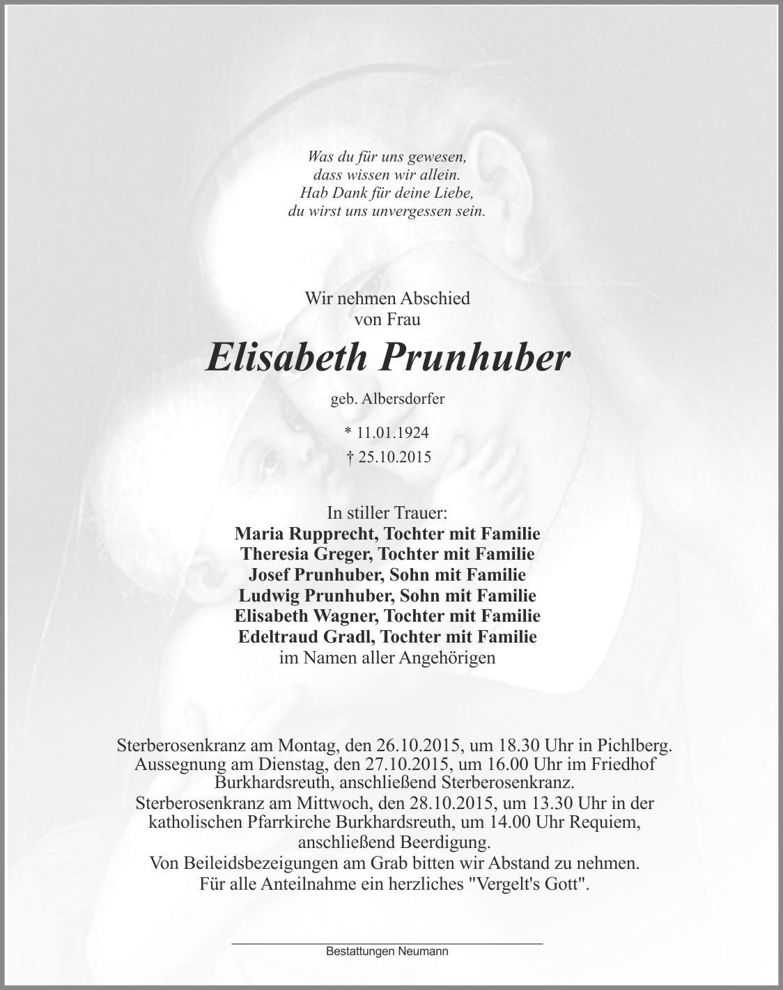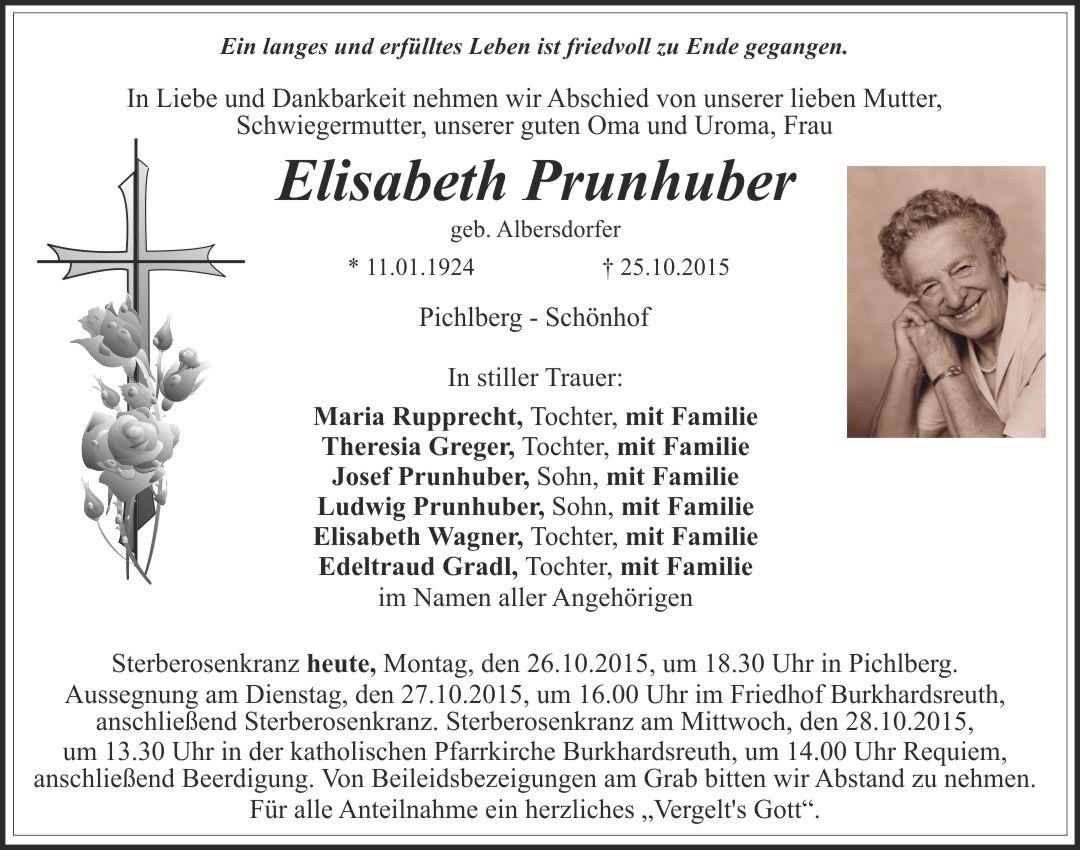 Sterberosenkranz am Montag, den 26.10.2015, um 18.30 Uhr in Pichlberg. Aussegnung am Dienstag, den 27.10.2015, um 16.00 Uhr im Friedhof Burkhardsreuth, anschließend Sterberosenkranz. Sterberosenkranz am Mittwoch, den 28.10.2015, um 13.30 Uhr in der katholischen Pfarrkirche Burkhardsreuth, um 14.00 Uhr Requiem, anschließend Beerdigung. Von Beileidsbezeigungen am Grab bitten wir Abstand zu nehmen. Für alle Anteilnahme ein herzlichen " Vergelt's Gott".