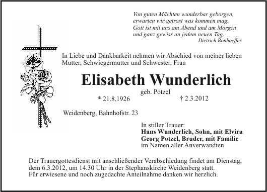Der Trauergottesdienst mit anschließender Verabschiedung findet am Dienstag, dem 6.3.2012, um 14.30 Uhr in der Stephanskirche Weidenberg statt.