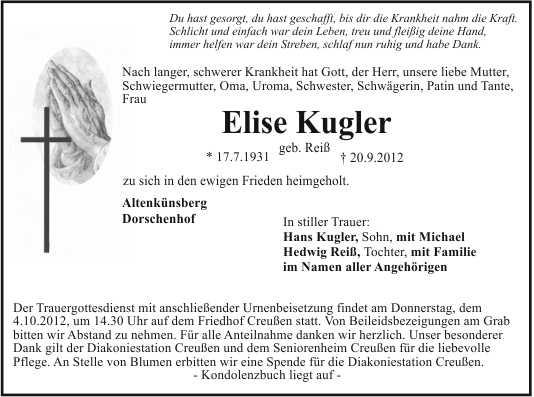 Der Trauergottesdienst mit anschließender Urnenbeisetzung findet am Donnerstag, dem 4.10.2012, um 14.30 Uhr auf dem Friedhof Creußen statt. Von Beileidsbezeigungen am Grab bitten wir Abstand zu nehmen. Für alle Anteilnahme danken wir herzlich. Unser besonderer Dank gilt der Diakoniestation Creußen und dem Seniorenheim Creußen für die liebevolle Pflege. An Stelle von Blumen erbitten wir eine Spende für die Diakoniestation Creußen.