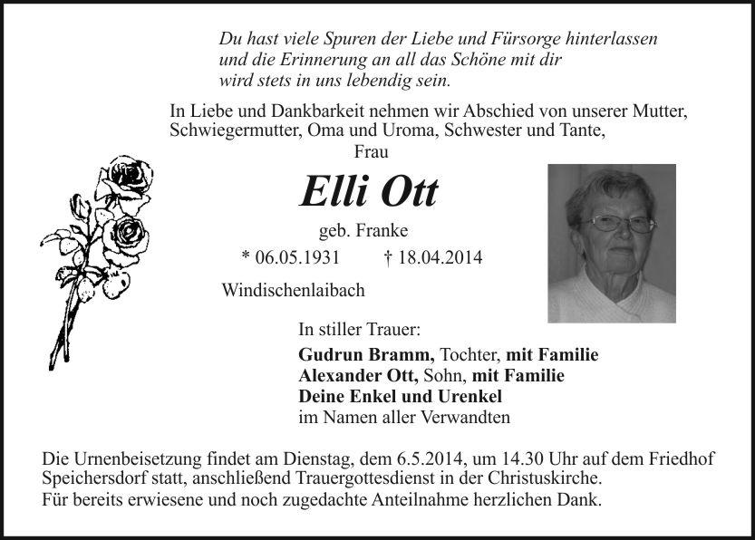 Die Urnenbeisetzung findet am Dienstag, dem 6.5.2014, um 14.30 Uhr auf dem Friedhof Speichersdorf statt, anschließend Trauergottesdienst in der Christuskirche.