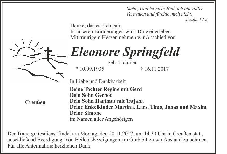 Der Trauergottesdienst findet am Montag, den 20.11.2017, um 14.30 Uhr in Creußen statt, anschließend Beerdigung. Von Beileidsbezeigungen am Grab bitten wir Abstand zu nehmen. Für alle Anteilnahme herzlichen Dank.
