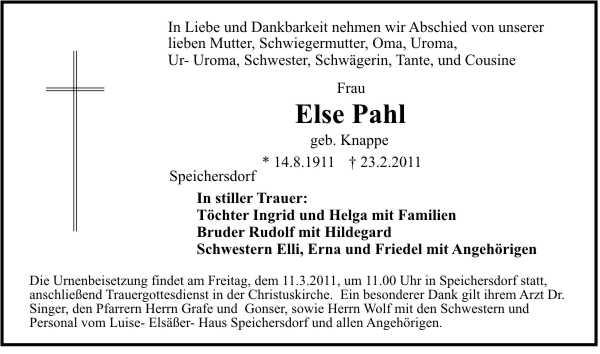 Die Beisetzung findet am Freitag, 11.03.2011 um 11:00 Uhr auf dem Friedhof in Speichersdorf statt.