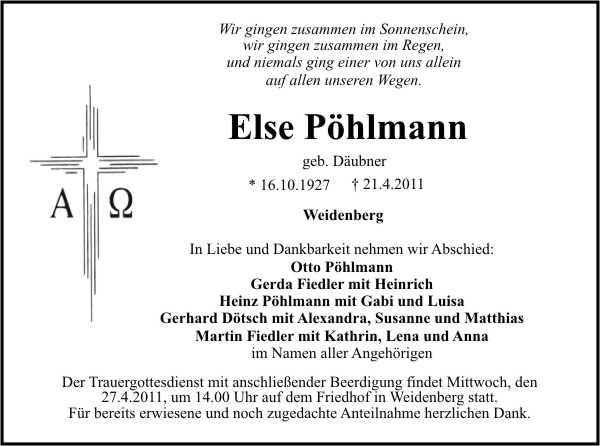 Der Trauergottesdienst mit anschließender Beerdigung findet Mittwoch, den 27.4.2011, um 14.00 Uhr auf dem Friedhof in Weidenberg statt.