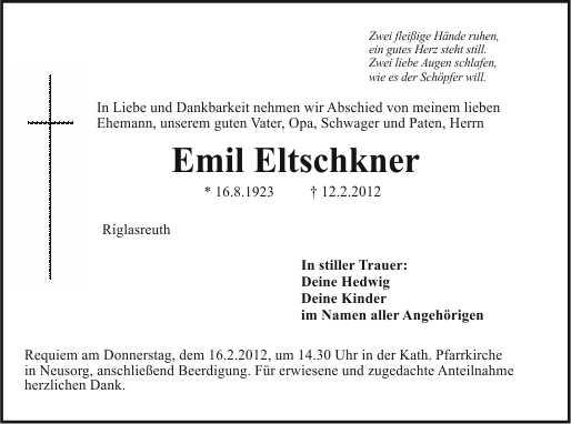 Requiem am Donnerstag, dem 16.2.2012 um 14.30 Uhr in der Kath. Pfarrkirche in Neusorg, anschließend Beerdigung. Für erwiesene und zugedachte Anteilnahme herzlichen Dank.