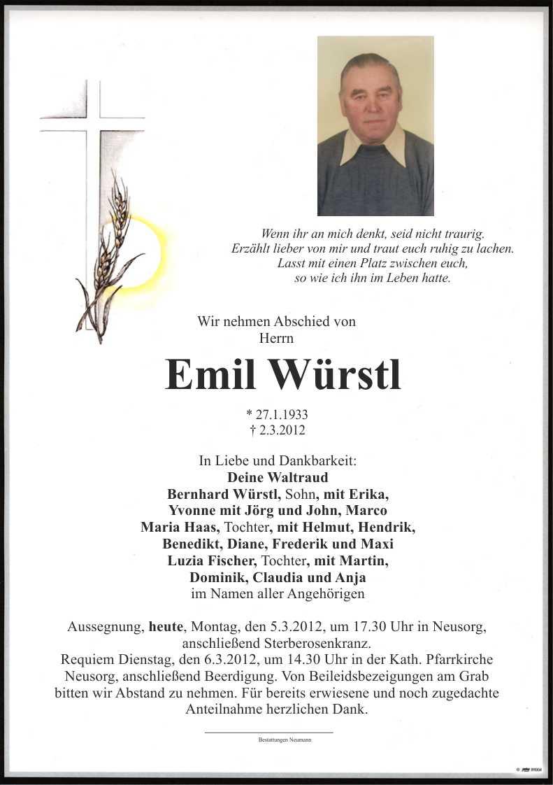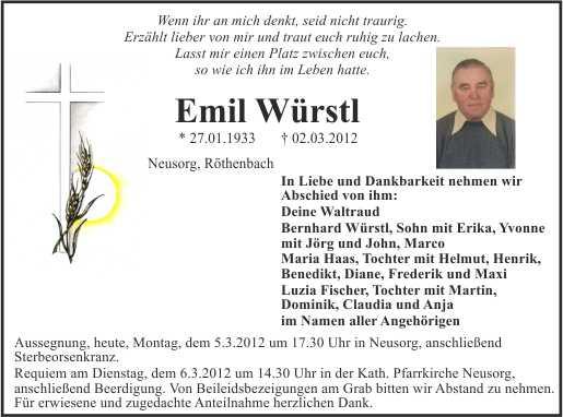 Requiem am Dienstag, dem 6.3.2012 um 14.30 Uhr in der Kath. Pfarrkirche Neusorg, anschließend Beerdigung. Von Beileidsbezeigungen am Grab bitten wir Abstand zu nehmen. Für erwiesene und zugedachte Anteilnahme herzlichen Dank.