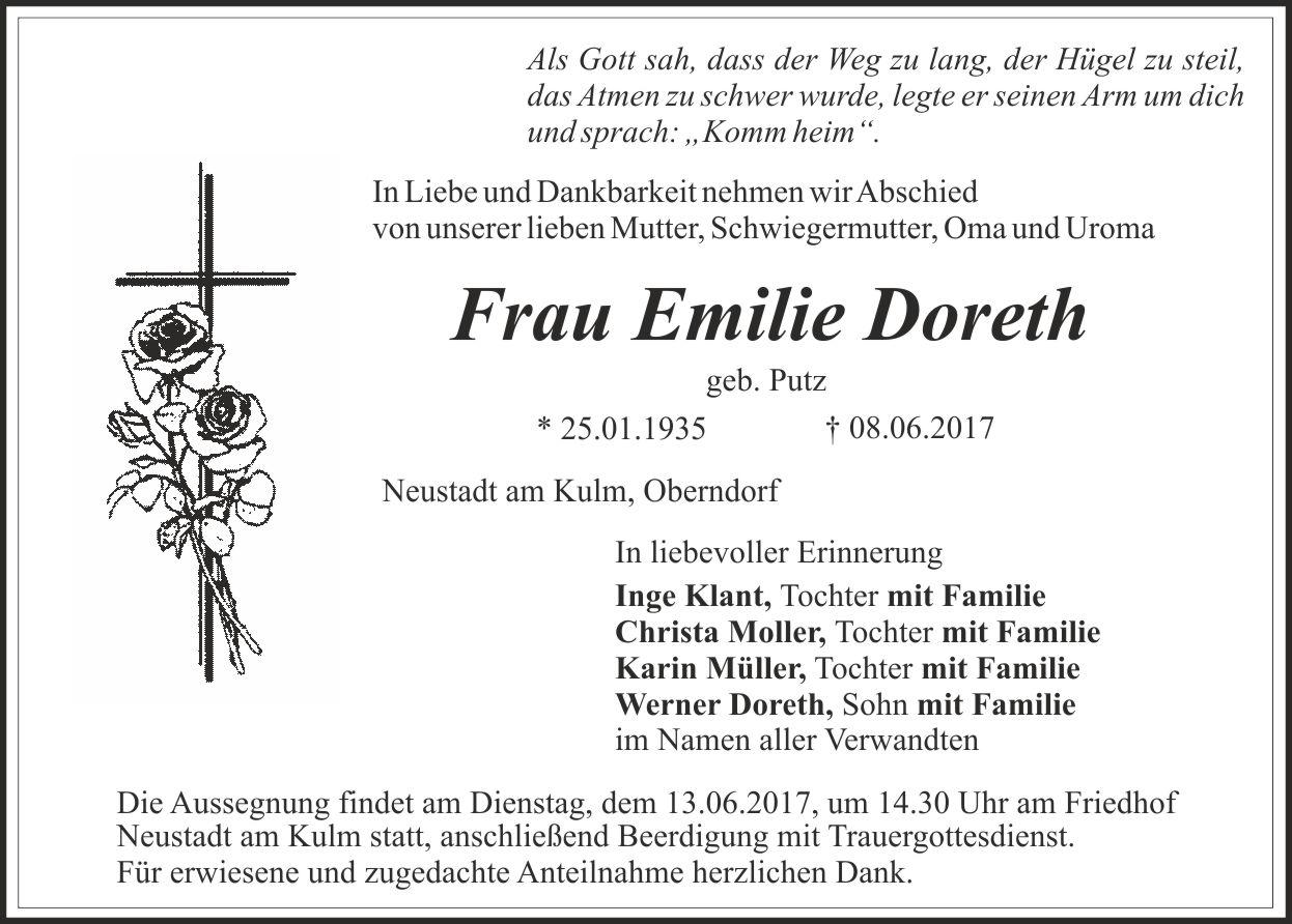 Aussegnung am Dienstag, den 13.06.2017, um 14.30 Uhr im Friedhof Neustadt am Kulm, anschließend Beerdigung und Trauergottesdienst. Für alle Anteilnahme herzlichen Dank.
