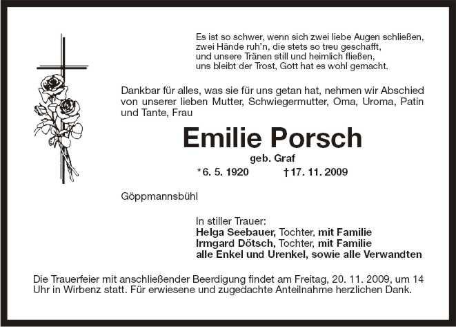 Die Beisetzung findet am Freitag, 20.11.2009 um 14:00 Uhr auf dem Friedhof in Wirbenz statt.
