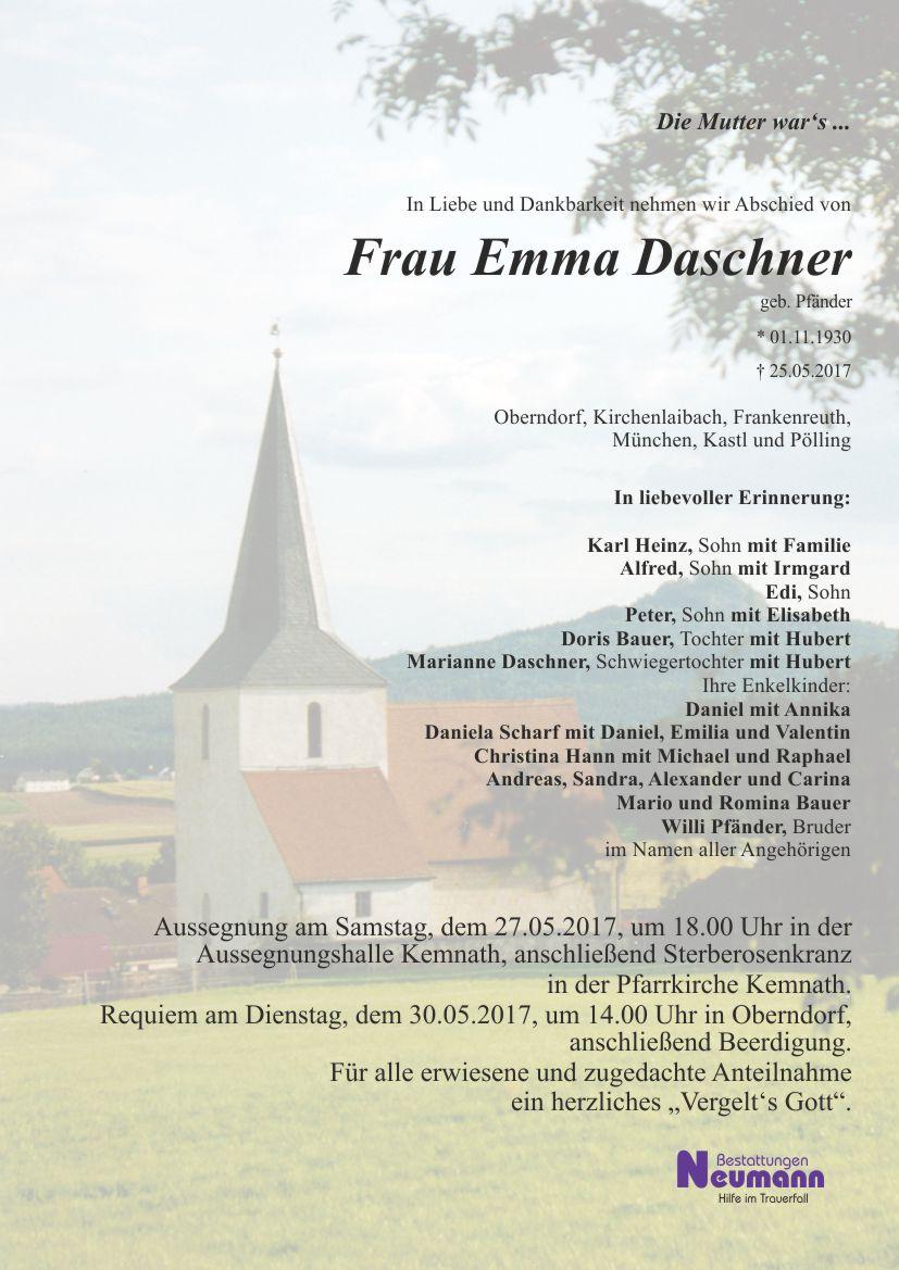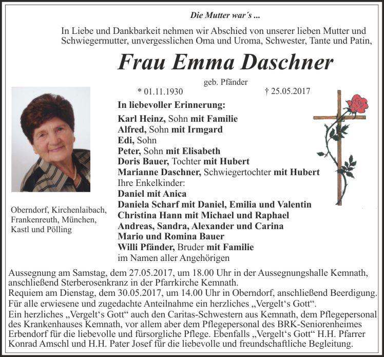 Aussegnung am Samstag, dem 27.05.2017, um 18.00 Uhr in der Aussegnungshalle Kemnath, anschließend Sterberosenkranz in der Pfarrkirche Kemnath.