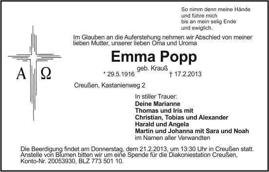 Die Beerdigung findet am Donnerstag, dem 21.2.2013, um 13:30 Uhr in Creußen statt. Anstelle von Blumen bitten wir um eine Spende für die Diakoniestation Creußen,