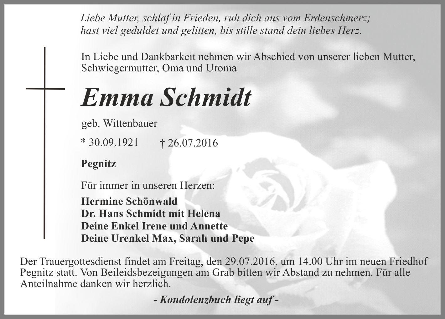 Der Trauergottesdienst findet am Freitag, den 29.07.2016, um 14.00 Uhr im neuen Friedhof Pegnitz statt, anschließend Beerdigung. Von Beileidsbezeigungen am Grab bitten wir Abstand zu nehmen. Für alle Anteilnahme bedanken wir uns herzlich. - Kondolenzbuch liegt auf -