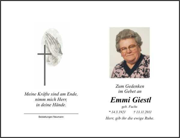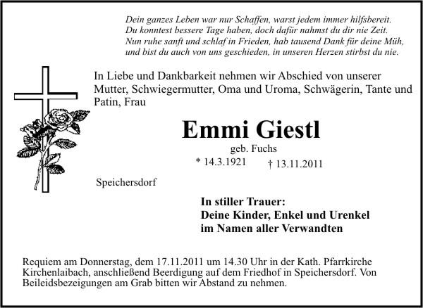 Requiem am Donnerstag, dem 17.11.2011 um 14.30 Uhr in der Kath. Pfarrkirche Kirchenlaibach, anschließend Beerdigung auf dem Friedhof in Speichersdorf. Von Beileidsbezeigungen am Grab bitten wir Abstand zu nehmen.