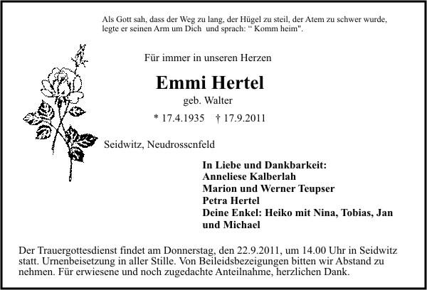Der Trauergottesdienst findet am Donnerstag, den 22.9.2011 um 14.00 Uhr in Seidwitz statt. Urnenbeisetzung in aller Stille.