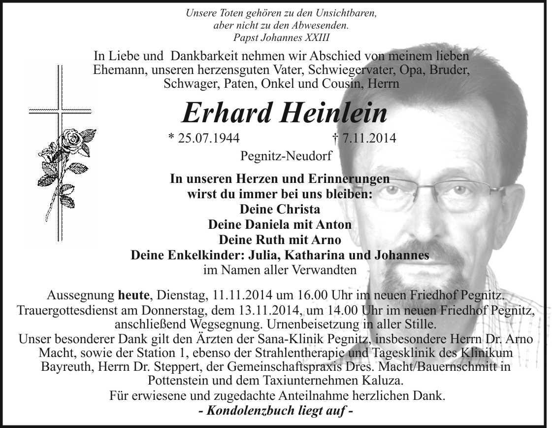 Trauergottesdienst am Donnerstag, dem 13.11.2014 um 14.00 Uhr im Neuen Friedhof Pegnitz, anschließend Wegsegnung. Urnenbeisetzung in aller Stille.