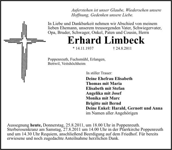 Aussegnung heute, Donnerstag, 25.8.2011, um 18.00 Uhr in Poppenreuth. Sterberosenkranz am Samstag, 27.8.2011 um 14.00 Uhr in der Pfarrkirche Poppenreuth und um 14.30 Uhr Requiem, anschließend Beerdigung auf dem Friedhof. Für bereits erwiesene und noch zugedachte Anteilnahme herzlichen Dank.