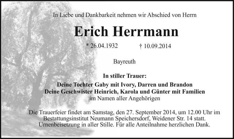 Die Trauerfeier findet am Samstag, den 27. September 2014, um 12.00 Uhr im Bestattungsinstitut Neumann Speichersdorf, Weidener Str. 14 statt. Urnenbeisetzung in aller Stille. Für alle Anteilnahme herzlichen Dank.
