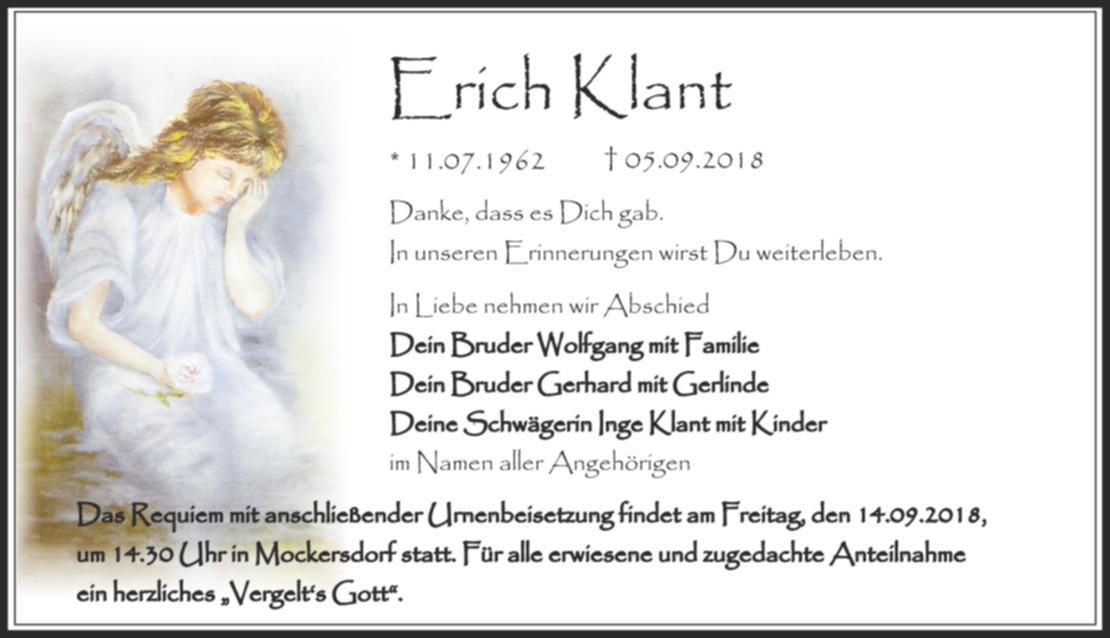 Das Requiem mit anschließender Urnenbeisetzung findet am Freitag, den 14.09.2018, um 14.30 Uhr in Mockersdorf statt. Für alle erwiesene und zugedachte Anteilnahme