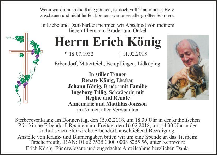 Sterberosenkranz am Donnerstag, den 15.02.2018, um 18.30 Uhr in der katholischen Pfarrkirche Erbendorf. Requiem am Freitag, den 16.02.2018, um 14.30 Uhr in der katholischen Pfarrkirche Erbendorf, anschließend Beerdigung.
