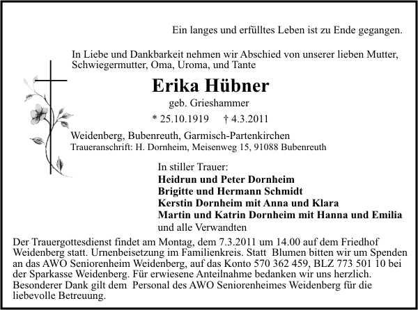 Der Trauergottesdienst findet am Montag, 7.3.2011 um 14.00 Uhr in der Stephanskirche Weidenberg statt. Urnenbeisetzung im Familienkreis.