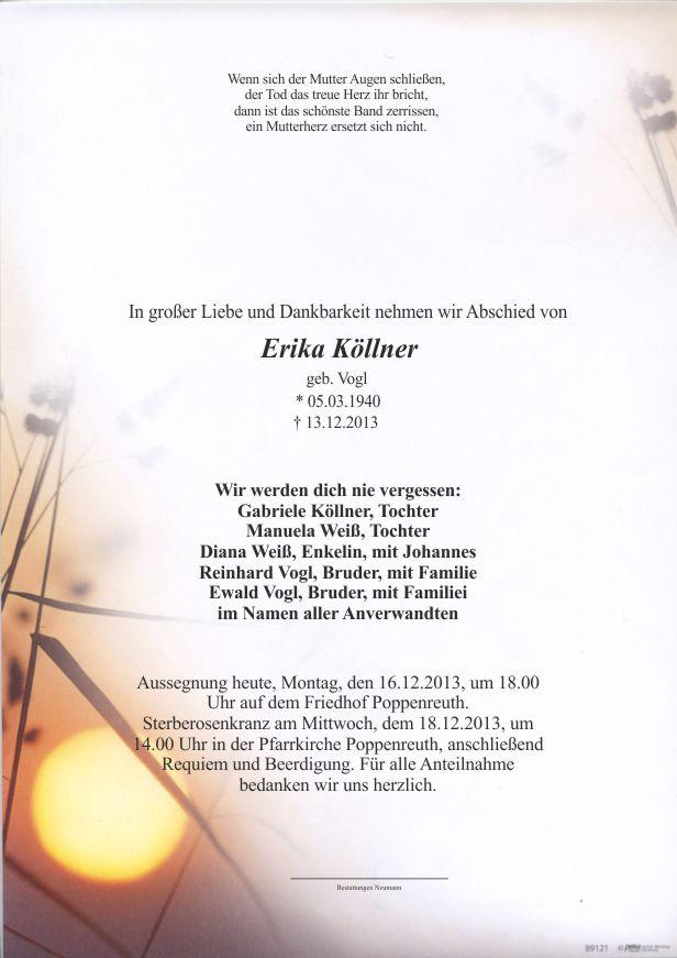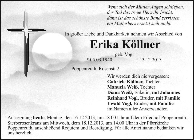 Sterberosenkranz am Mittwoch, dem 18.12.2013, um 14.00 Uhr in der Pfarrkirche Poppenreuth, anschließend Requiem und Beerdigung. Für alle Anteilnahme bedanken wir uns herzlich.