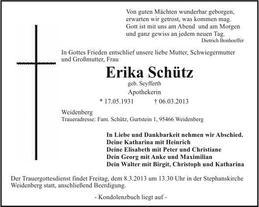 Der Trauergottesdienst findet Freitag, dem 8.3.2013 um 13.30 Uhr in der Stephanskirche Weidenberg statt, anschließend Beerdigung.
