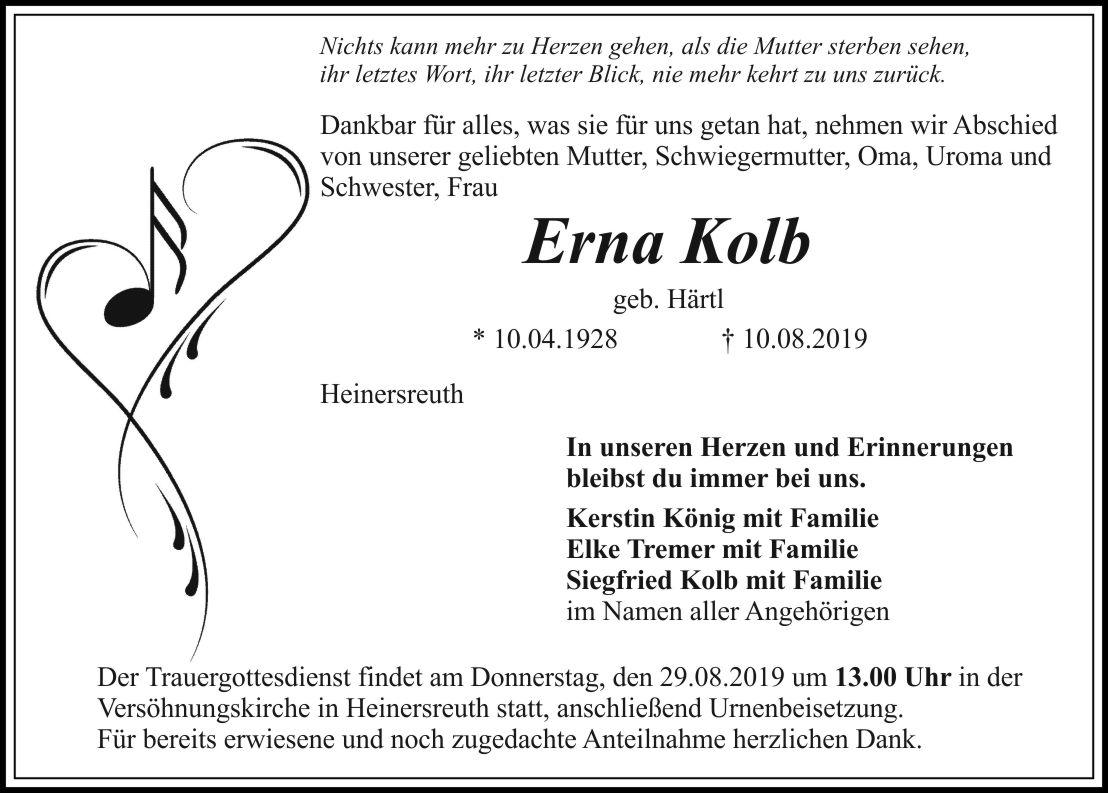 Der Trauergottesdienst findet am Donnerstag, den 29.08.2019 um 13.00 Uhr in der Versöhnungskirche in Heinersreuth statt, anschließend Urnenbeisetzung.