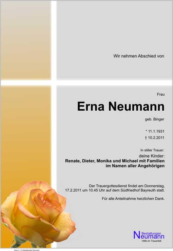 Die Trauerfeier findet am Donnerstag dem 17.2.2011 um 10.45 Uhr auf dem Südfriedhof in Bayreuth statt. Urnenbeisetzung im Familienkreis.