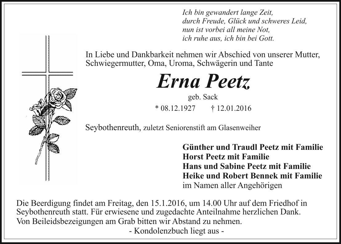Der Trauergottesdienst findet am Freitag, den 15.01.2016, um 14.00 Uhr in Seybothenreuth statt, anschließend Beerdigung. Von Beileidsbezeigungen am Grab bitten wir Abstand zu nehmen. Für bereits erwiesene und noch zugedachte Anteilnahme herzlichen Dank. - Kondolenzbuch liegt aus -