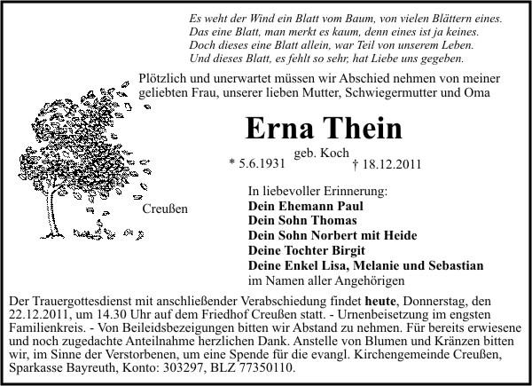 Der Trauergottesdienst mit anschließender Verabschiedung findet Donnerstag, den 22.12.2011, um 14.30 Uhr auf dem Friedhof Creußen statt.- Urnenbeisetzung im engsten Familienkreis- Von Beileidsbezeigungen bitten wir Abstand zu nehmen. Für bereits erwiesene und noch zugedachte Anteilnahme herzlichen Dank.