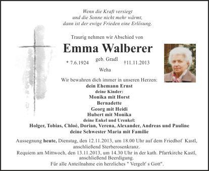 Requiem am Mittwoch, den 13.11.2013, um 14.30 Uhr in der kath. Pfarrkirche Kastl, anschließend Beerdigung.