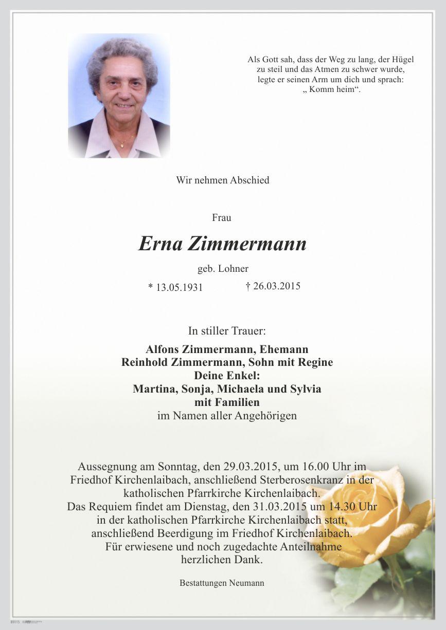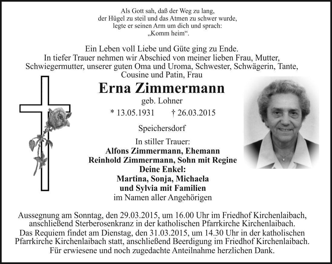 Aussegnung am Sonntag, den 29.03.2015, um 16.00 Uhr im Friedhof Kirchenlaibach, anschließend Sterberosenkranz in der katholischen Pfarrkirche Kirchenlaibach.